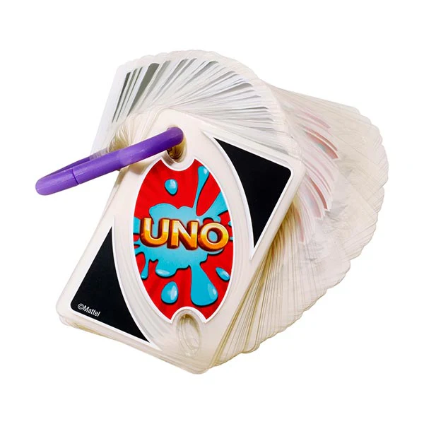 UNO™ es el juego que puedes jugar en cualquier momento, con cualquier persona y, ahora, se hace más fácil jugarlo en cualquier lugar. Las cartas plásticas duraderas son resistentes al agua para que puedas disfrutar del juego en cualquier lugar, incluso al aire libre. Además, esta versión viene con un práctico clip que mantiene todas las cartas juntas y se puede sujetar a un bolso de playa, una mochila o un equipo de campamento. Haz coincidir los colores o números, o juega una carta de acción contra tu oponente. Consigue puntos siendo el primero en deshacerte de todas las cartas de tu mano. Contiene 108 cartas. Juega UNO™ cuando quieras y no olvides: cuando solo te quede una carta, ¡grita “UNO”!