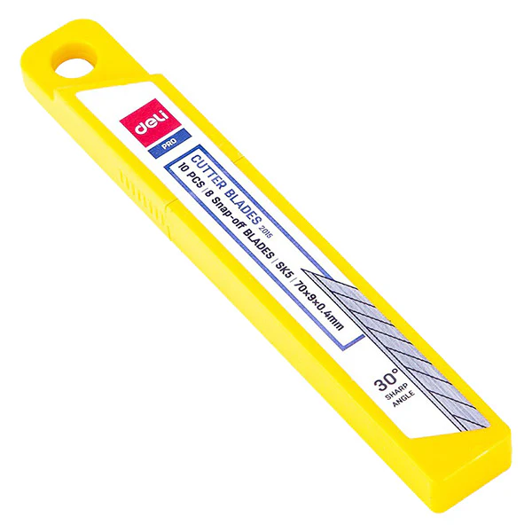 Hoja de acero duradera. – Combina el Deli E2034. – Paquete de caja PP portátil (10 piezas / caja) – Punta de cuchilla de 30 grados para un corte más nítido y fácil. – Hoja de acero SK5 dura para un corte fácil y un uso duradero.