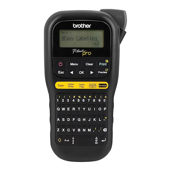 compatible con cintas laminadas TZE de 12 mm. Perfecto para etiquetar cables, placas frontales y serialización con precisión. Compacto y eficiente, mide 10.5×19.5×28.5 cm, ideal para oficinas y entornos industriales. ¡Organización profesional con Brother!